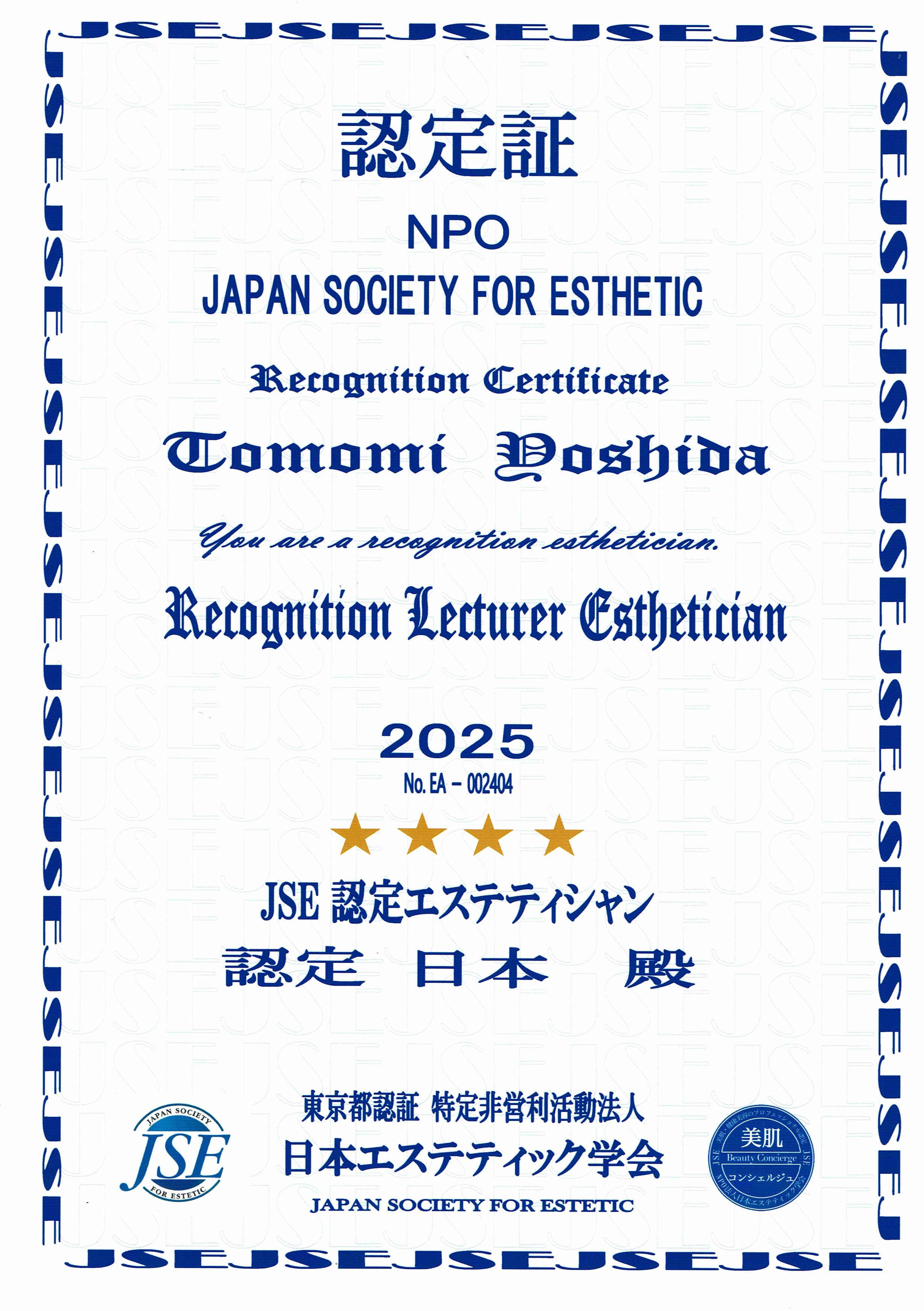 NPO法人日本エステティック学会(JSE)が主催する本養成制度は、 高度な技術、幅広い知識、的確なマナーを持つエステティシャンを養成しするため、合計1500時間のカリキュラムを設定を目指しております。 【カリキュラム】